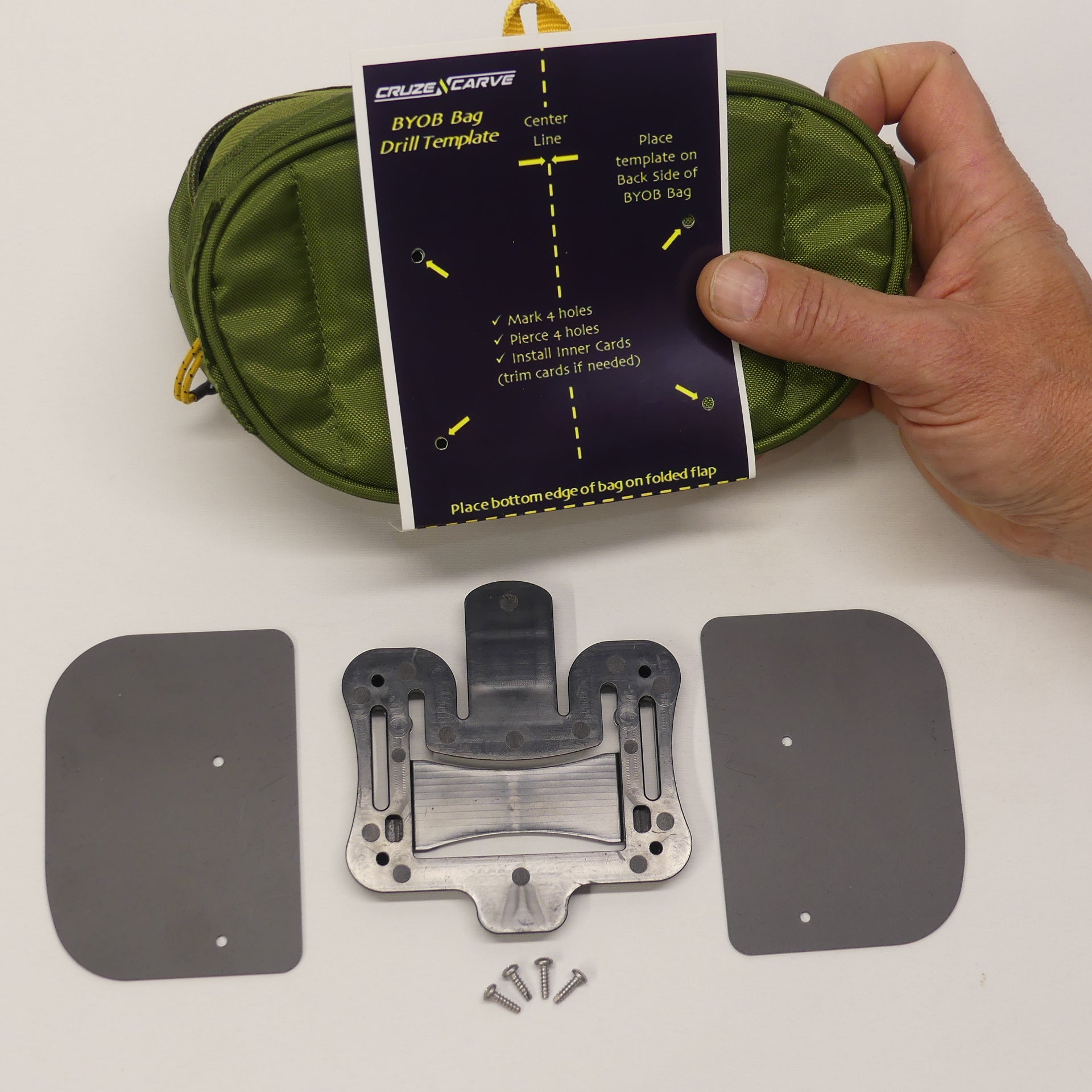 Assembly Required: Using the Attachment Template included in your kit, you will need to drill, or otherwise pierce, 4 holes through your BYOB pack.